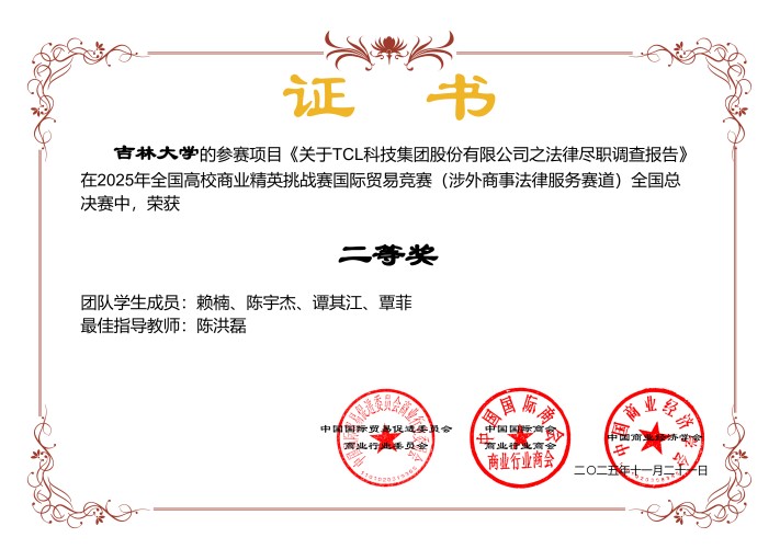 全国高校商业精英挑战赛是纳入教育部高等教育学会“全国普通高校大学生竞赛排行榜”的重要赛事,属于吉林大学本科学生学科竞赛B*等级。涉外商事法律服务赛道要求参赛团队以法律服务机构身份,对真实企业开展全面的法律尽职调查。