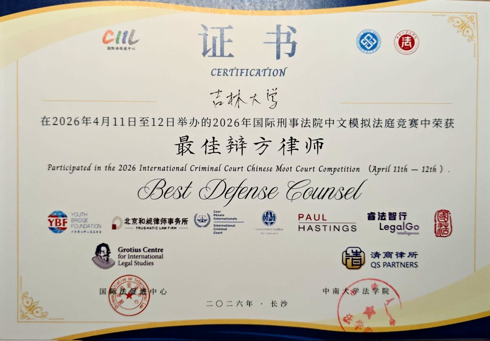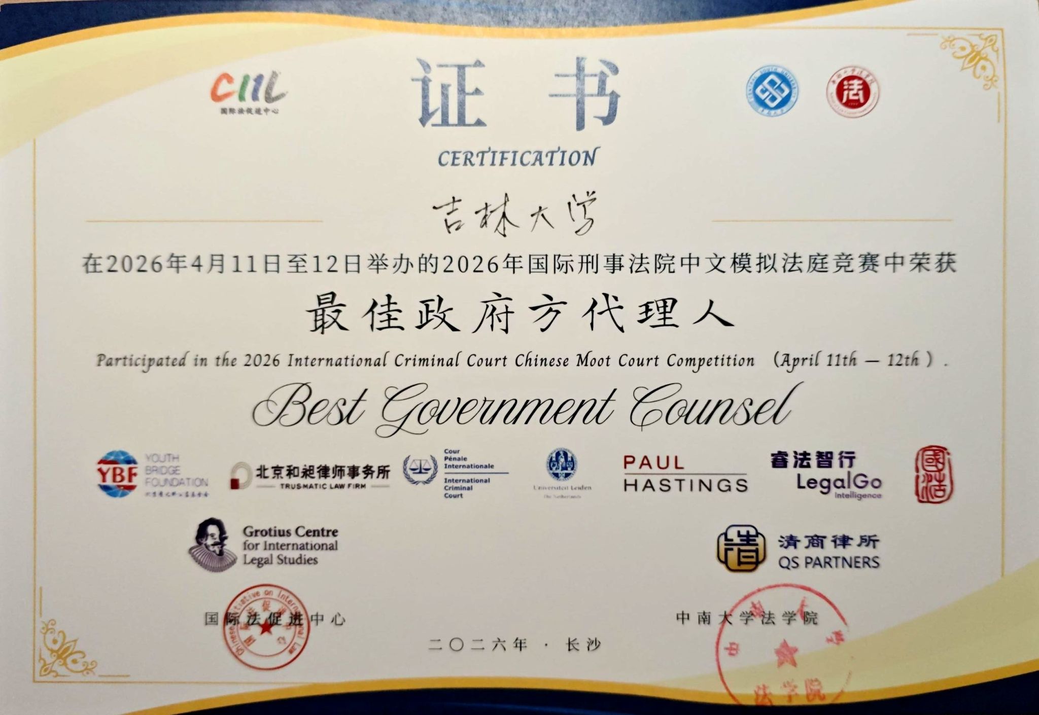 2026年4月11日至12日,2026年国际刑事法院中文模拟法庭竞赛在中南大学潇湘校区举办。本届赛事共吸引了130支代表队参与,参赛队伍数量再创历史新高。本项赛事由中国国际法促进中心与国际刑事法院协办,要求参赛各队围绕国际刑事法院属地管辖权、攻击人道主义援助的战争罪、非缔约国国家元首豁免权、非法移交等核心争议焦点撰写书状、进行庭辩。