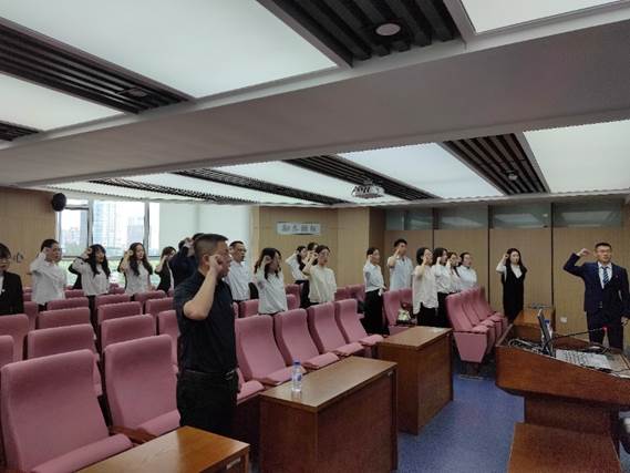 2019级法学硕士第三党支部书记王昊程的带领下举起右拳,面向党旗,庄严宣誓。激昂的誓言深深烙印在每位党员心中。