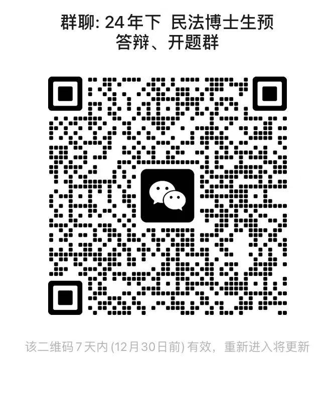 请符合前述要求的博士研究生及时扫码入群(博士生入群后请在“我在本群的昵称”中写明“预答辩/开题+姓名+导师姓名”,如:预答辩+张三+导师姓名)。