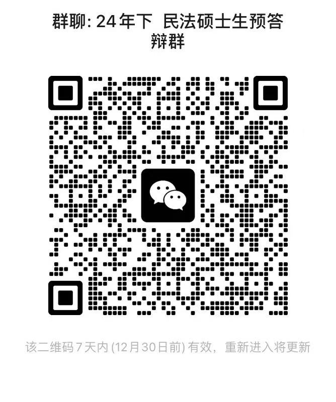 请参与本次预答辩的硕士研究生及时扫码入群(硕士生入群后请在“我在本群的昵称”中写明“学硕/法本法硕/非法本法硕+姓名+导师姓名”,如:学硕+张三+导师姓名)。